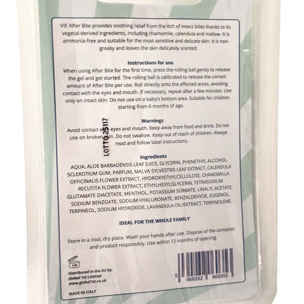 - Vie After Bite Roll-on provides gentle, soothing relief from the itch and discomfort of insect bites using plant-derived ingredients such as chamomile, calendula, mallow and aloe vera. The light gel texture is non greasy, delicately scented and absorbs quickly, helping to calm irritated skin without leaving residue. Dermatologically tested, it is suitable for sensitive and delicate skin and can be used on children from 6 months of age, making it ideal for family holidays, days out and everyday use. The convenient roll-on format allows precise application directly onto the affected area so you can relieve irritation quickly whenever needed, at home or on the go.